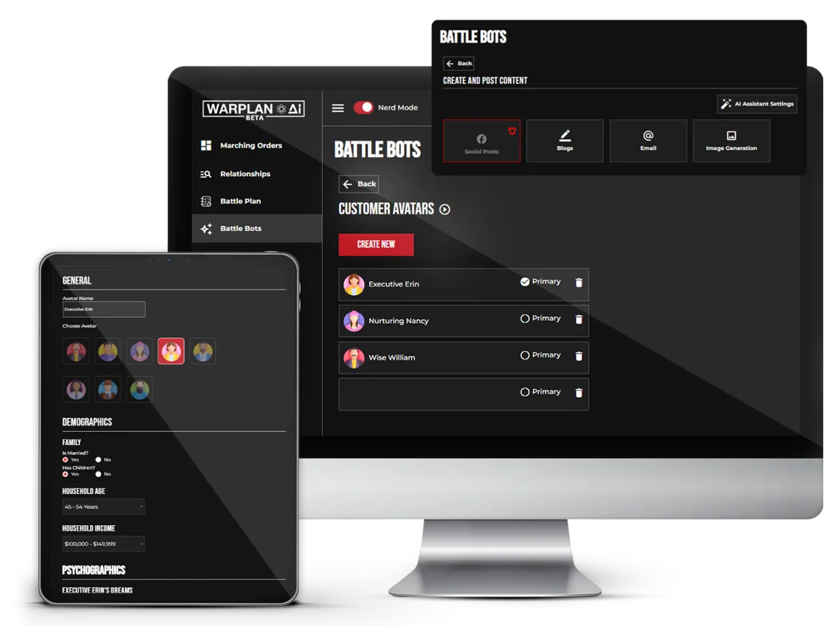 Automate your email and your social media content using our extensive "battle bot" tools, which are artificial intelligence tools trained on your specific business to take a load off of you