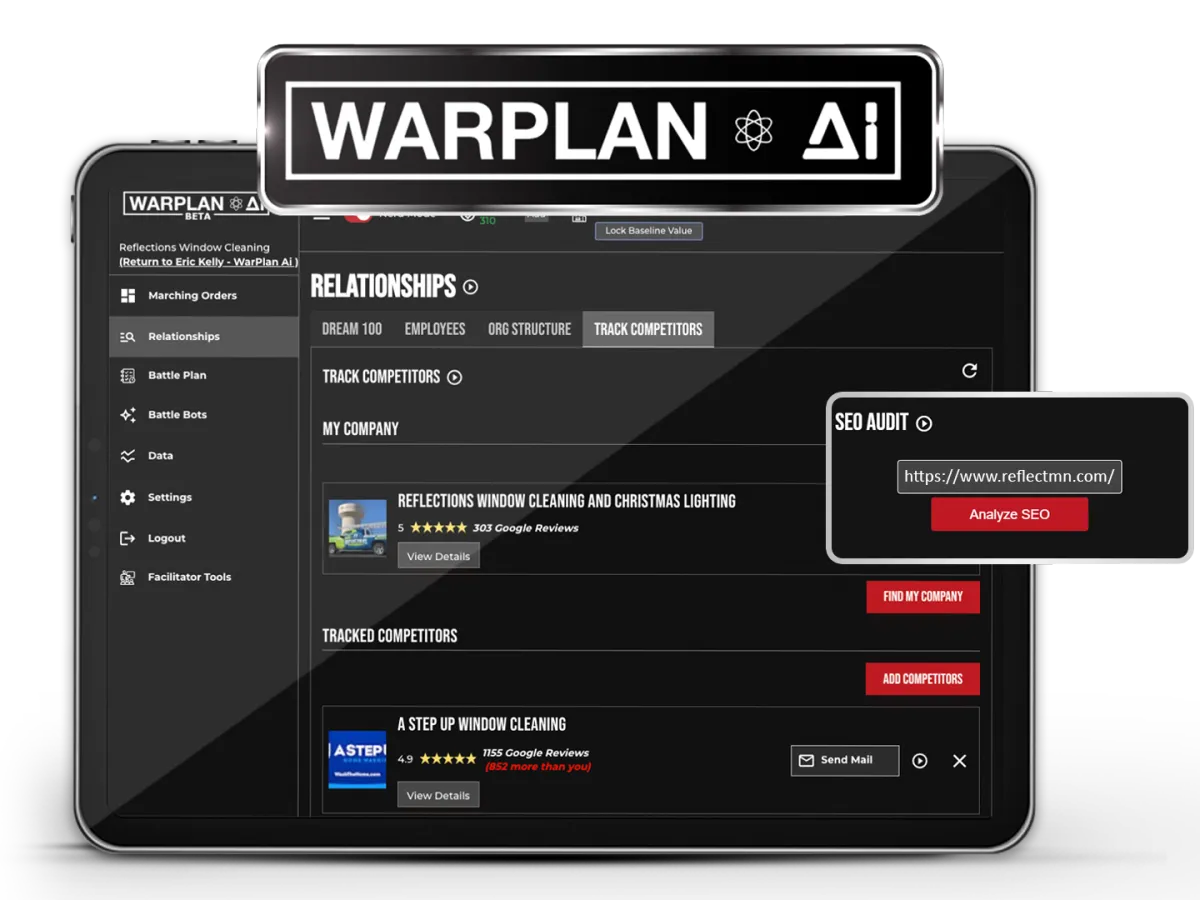 WarPlan Ai is designed specifically for local business owners, especially in the home service industry. We've worked with people in pressure washing, window cleaning, softwashing, roof cleaning, gutter cleaning, carpet cleaning, maid services, restaurants, cleaning services, landscape lighters, Christmas light installation, dryer vent cleaning, paver sealing, appliance repair, automotive repair and dozens of other industries.